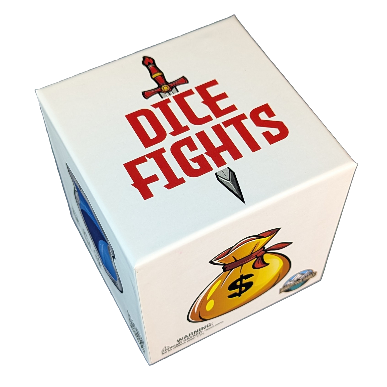 Dice Fights is a fast-paced, 15–30 minute two-player battle where every roll counts. Start with Core Dice, a Bank, a Life Tracker, and Multipliers, then roll to attack, defend, and earn gold. Spend gold to power up, add dice, and outplay your opponent. Even the box is a die! Each box acts as its own expansion, letting more players jump in.